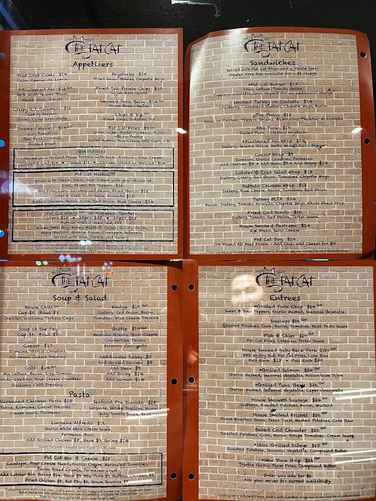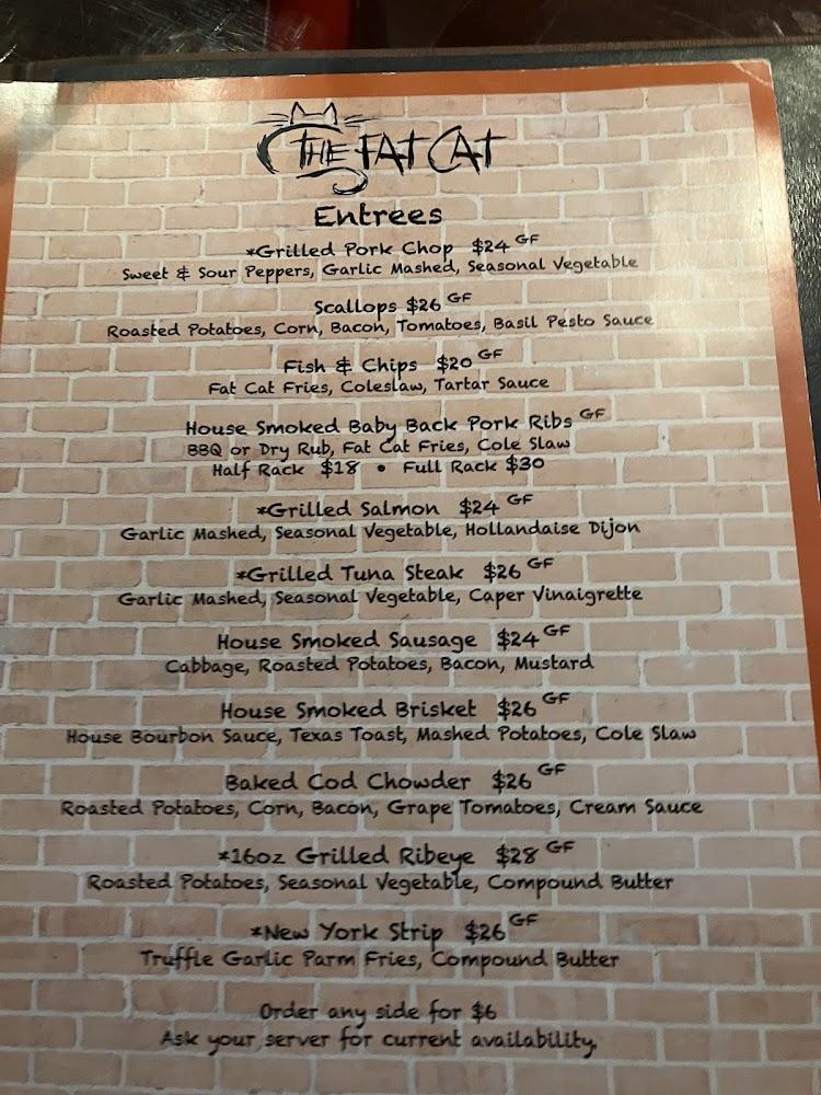 The menu at The Fat Cat caters to various tastes, focusing on American comfort food. Diners can find something to satisfy any craving. Starters like sizzling calamari and crab cakes entice guests to begin their dining experience. For the main course, the Rib and Lobster Mac are popular, showcasing the restaurant's commitment to flavor. Sandwiches and wraps provide great options for lighter meals. Each dish is crafted with care, ensuring quality and taste. Soups and salads are fresh and perfect as sides or on their own. Desserts round off a delightful meal, perfect for sweet lovers. Overall, the menu reflects diner favorites and new takes on classic dishes.